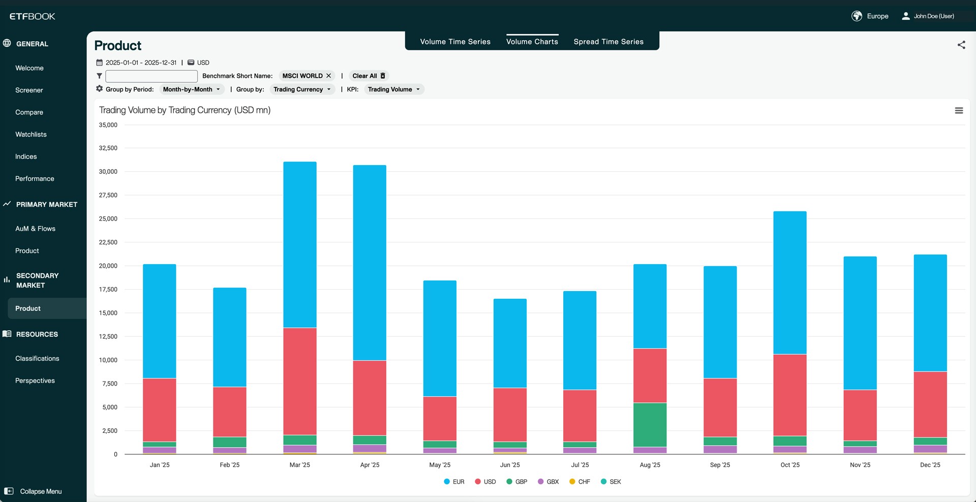 T+1 verified trade data across 10 000+ ETFs in Europe and the US.